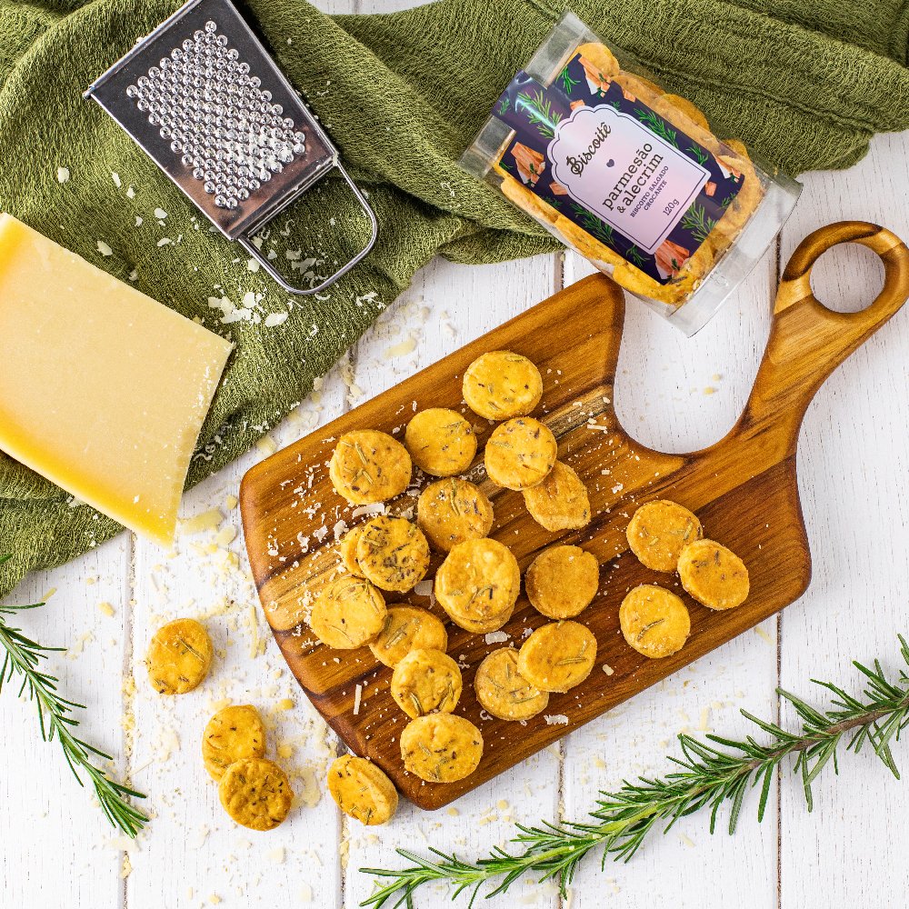 Neste biscoito, o parmesão cobre a massa que, quando vai ao forno e forma uma casquinha crocante por fora. Para completar a receita com um aroma marcante, a Biscoitê adicionou alecrim à massa.